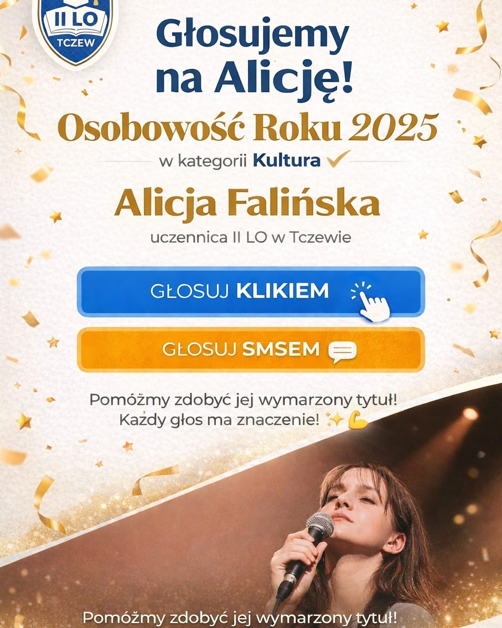 Zachęcamy całą społeczność szkolną: uczniów, rodziców, nauczycieli i absolwentów – wesprzyjmy Alicję i pokażmy, że trzymamy za siebie kciuki!